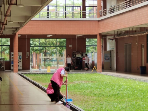 在创新楼一楼,志愿者们按照负责人的指令,有序打扫着教室办公室、楼梯。在活动中同学们积极行动,仔细地打扫着角落里的垃圾,就连边角的细小尘埃也被认真的收集起来。