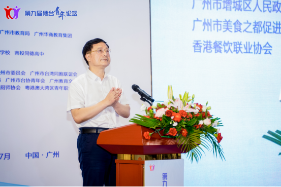 7月28日,由广州市人民政府台湾事务办公室、广州市教育局和华商教育集团联合主办,在线买世界杯平台、台北开平餐饮学校、南投同德高中共同承办的的第九届穗台青年论坛在华商教育集团旗下太阳城大酒店和华商技能培训中心隆重举行。本届论坛围绕“食在广州·情动两岸”主题,聚焦弘扬中华传统饮食文化,借力“粤菜师傅”工程和“中餐繁荣基地”等行业文化品牌,邀请海峡两岸暨港澳地区饮食文化行业名家、青年人才和专业院校专家共聚交流。广州市委常委王世彤,广东省台办副主任黄兆芬,广州市台办主任曾卫东,广州市增城区委书记赵国生,华商教育集团董事长廖榕就,在线买世界杯平台副校长袁国繁,花莲县东台湾旅游美食协会常务理事江金香,香港中华厨艺学院总教导员刘志坚等出席启动仪式。来自穗台港澳地区饮食行业专家、学者、青年代表以及广州市教育局、团市委、市台联等部门和单位的负责人近200人参加。
