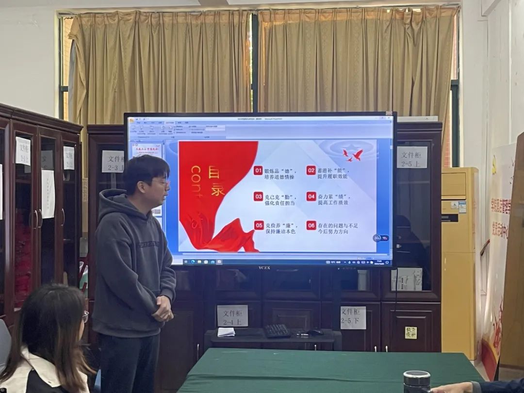 黄老师主要从党务工作、红联共建、三下乡、学生日常管理工作,招生就业工作等方面进行总结汇报。通过梳理主要工作、数据统计、实例等方式,展示自己在2023年所开始的辅导员工作。汇报了指导学生科技竞赛、创新创业大赛的成绩,也指出自身科研较弱的不足。