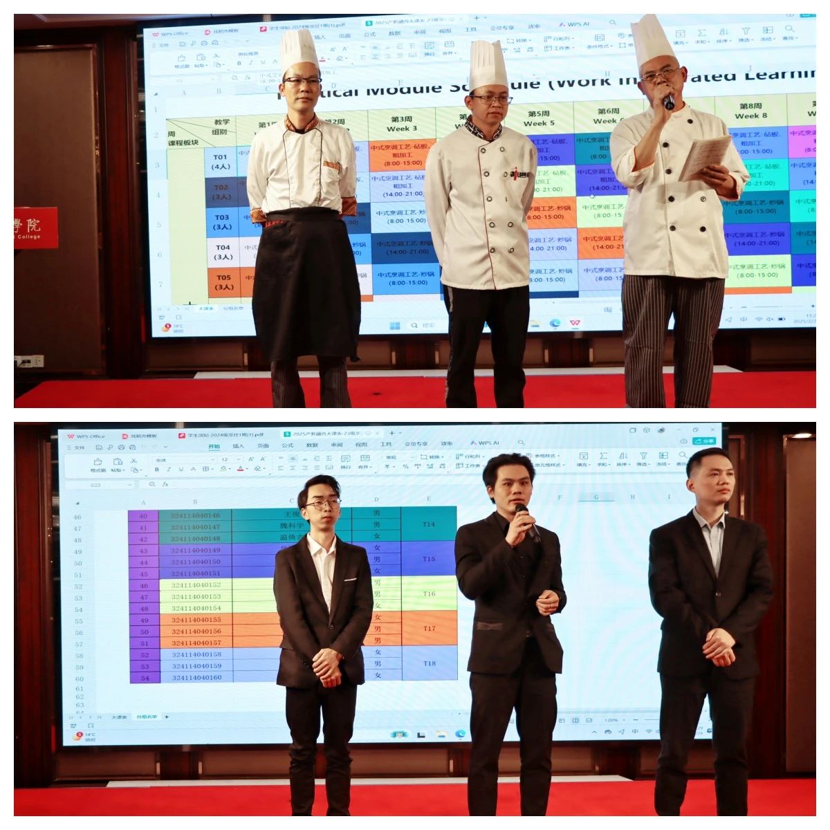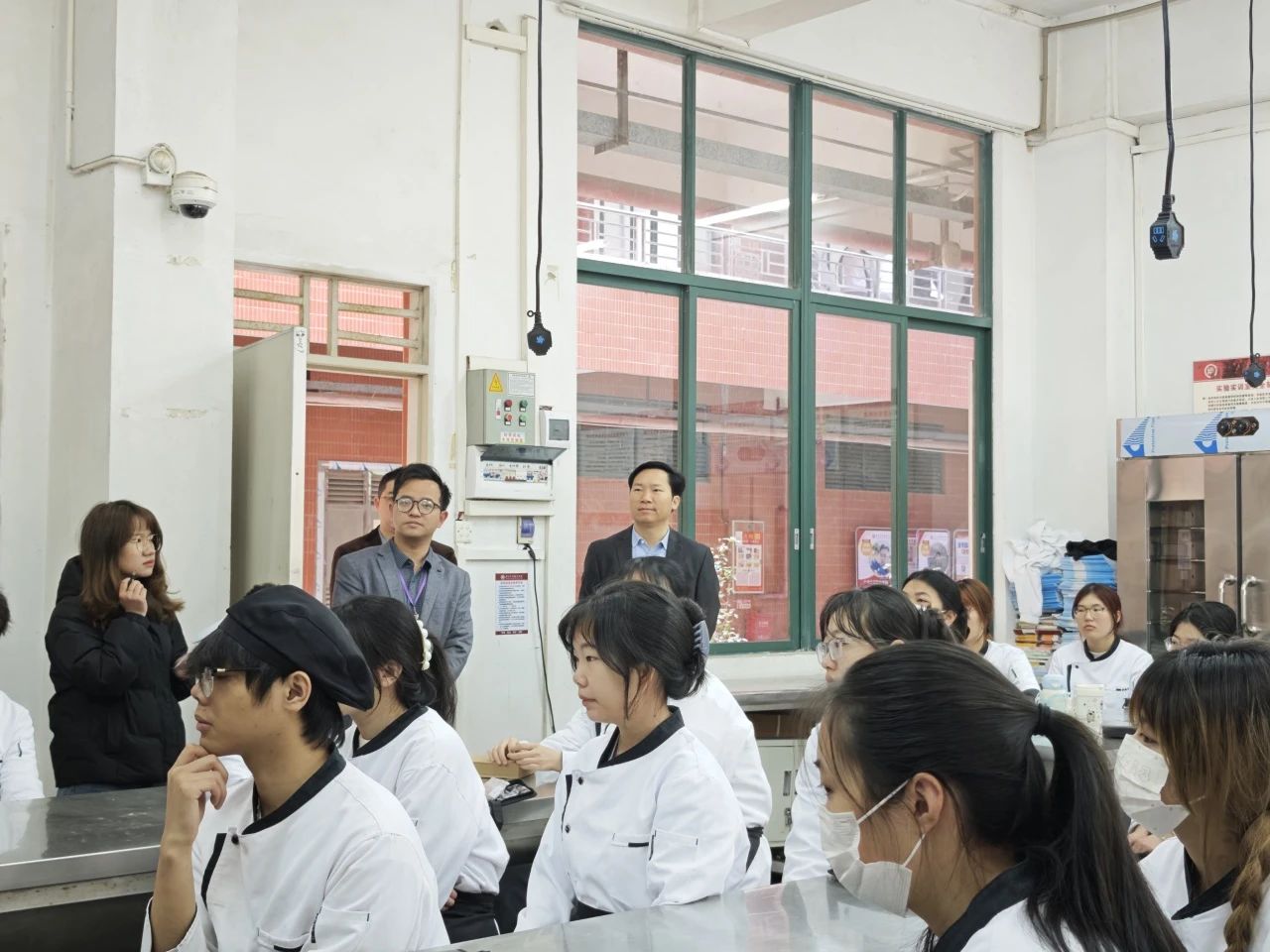 新学期开学第一课教学巡查除了关注校本部的教学情况外,世界杯官网领导、老师还重点巡查了在太阳城附属教学酒店开展实践学习的班级情况。酒店管理学院院长林红梅、副院长何洪健、谢锦权以及辅导员、“双岗”教师们与24级烹饪工艺与营养1班全体同学进行了面对面的互动。