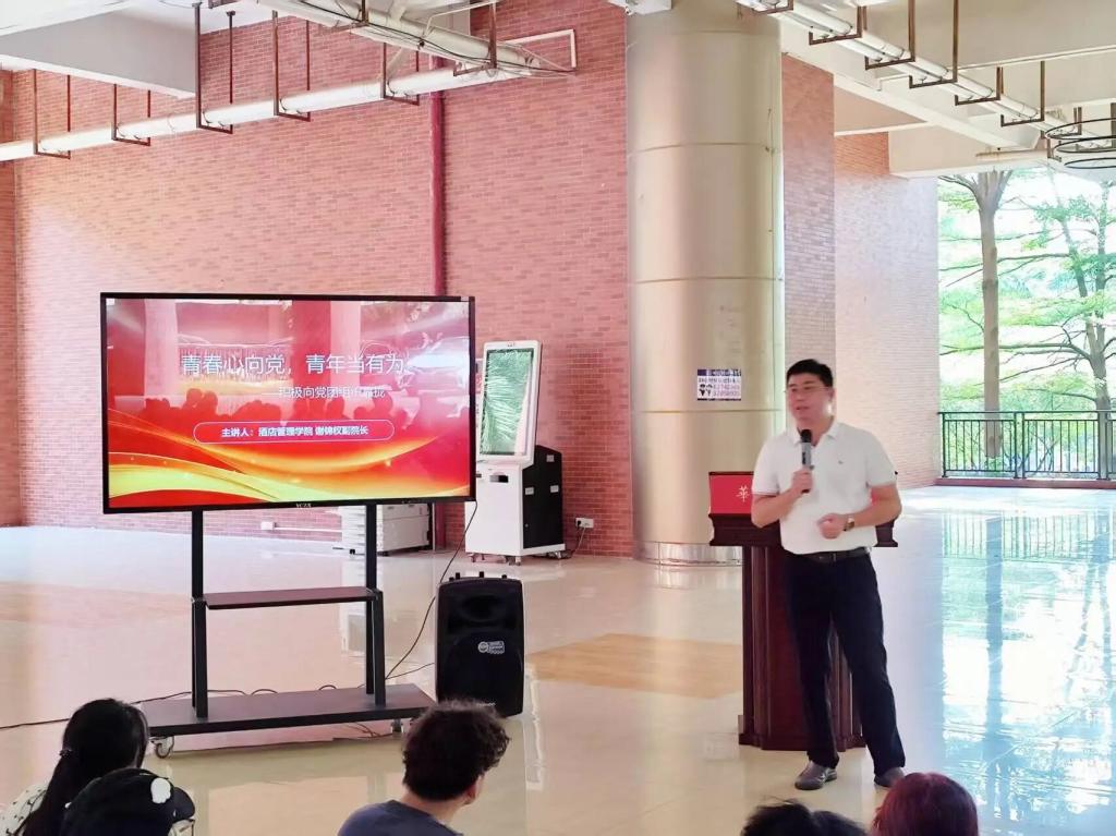 学院副院长谢锦权以“青春心向党,青年当有为”为主题,向新生们发出诚挚号召,希望同学们积极主动地以良好的实际行动向党组织、团组织靠拢,积极追求进步。他深入浅出地引导同学们深入思考,帮助大家端正入团、入党动机,筑牢理想信念根基,让青春在不懈奋斗中绽放绚丽之花。最后,他寄语全体新生:大学生活是一片充满无限可能的广阔天地,唯有以奋斗为笔,以汗水为墨,才能在这青春的画卷上绘就最绚丽的青春篇章,书写属于自己的精彩大学之旅。