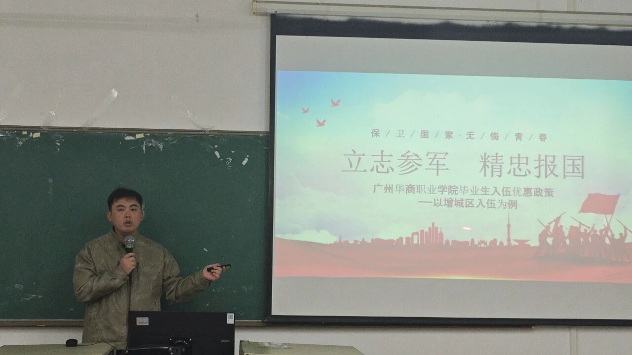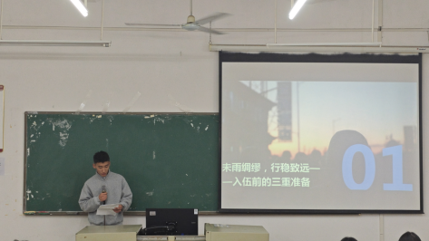 学院谢锦权副院长为参军动员宣讲会致开场辞,他欢迎并肯定有志参军的同学,阐释了新时代青年入伍的重要意义,指出入伍既是法定义务,也是磨砺意志、实现价值的契机。他点赞谢甲申、刘蔚峰两位退伍学子的优良作风,认为这是学院育人成效的体现,同时勉励同学们胸怀家国、锤炼意志、练就本领,将个人理想融入强军事业,呼吁大家积极响应征兵号召,在军营书写无悔青春,并预祝宣讲会圆满成功。
