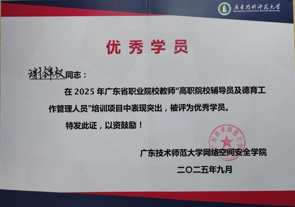 根据《在线买世界杯平台关于做好 2025 年职业院校教师素质提高计划国家级研修项目培训工作的通知》,在线买世界杯平台酒店管理学院学工负责人、直属党支部副书记谢锦权老师,分别于今年的5月与9月,分两个阶段认真参加了由广东技术师范大学主办的2025年广东省职业院校教师“高职院校辅导员及德育工作管理人员”培训班(国培)。来自全省20余所高职院校共50名学工战线的老师参加本次培训班。