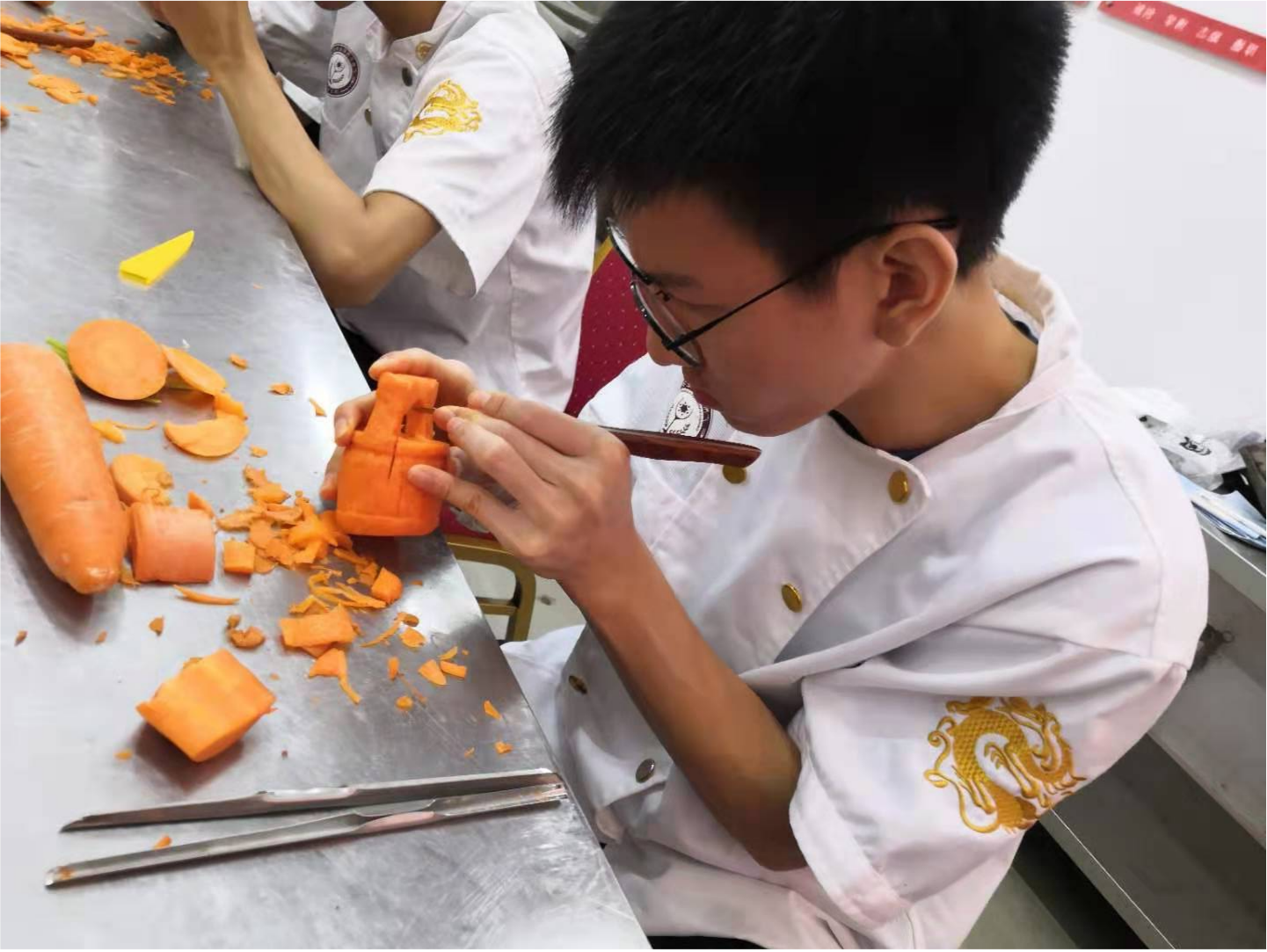 今天我们走进酒店管理学院的实训课堂,中国烹饪大师李绪彬老师正在指导学生开展食品雕刻训练。本次食品雕刻的主题是“水桶”,李大师耐心地向同学们讲解步骤、要领,并一一做了示范。在实践环节,同学们发扬工匠精神,精益求精,给老师交出了自己用心雕刻的作品。李大师对每一个作品都作出点评,给予了恰当的评价。