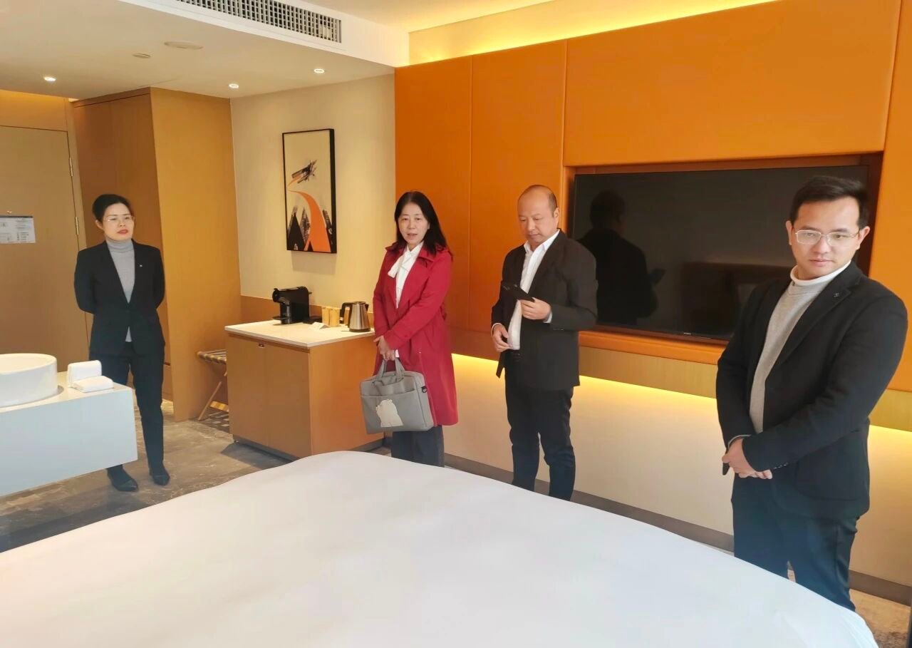 1月22日下午,学院领导班子与方雪、周期、张建老师会合,一同来到广州广云国际酒店管理有限公司第一分公司进行调研交流。作为拥有丰富的高端会议接待经验以及大型赛事的住宿与餐饮服务经验的大型酒店群,广州广云国际酒店管理有限公司第一分公司,连同广州广云国际酒店管理有限公司广州白云国际会议中心越秀福朋喜来登酒店分公司、广州广云国际酒店管理有限公司广州白云国际会议中心越秀源宿酒店分公司,是此次考察现代酒店服务业的重点企业。在该酒店群人力资源总监何静以及人事部经理陈莹莹的带领下,考察组实地参观了酒店群的各个功能区。双方围绕大学生实习与就业、订单班人才培养、课程共创、横向课题项目,以及大型会议接待、竞赛安排、企业培训等方面展开了广泛深入的研讨交流。