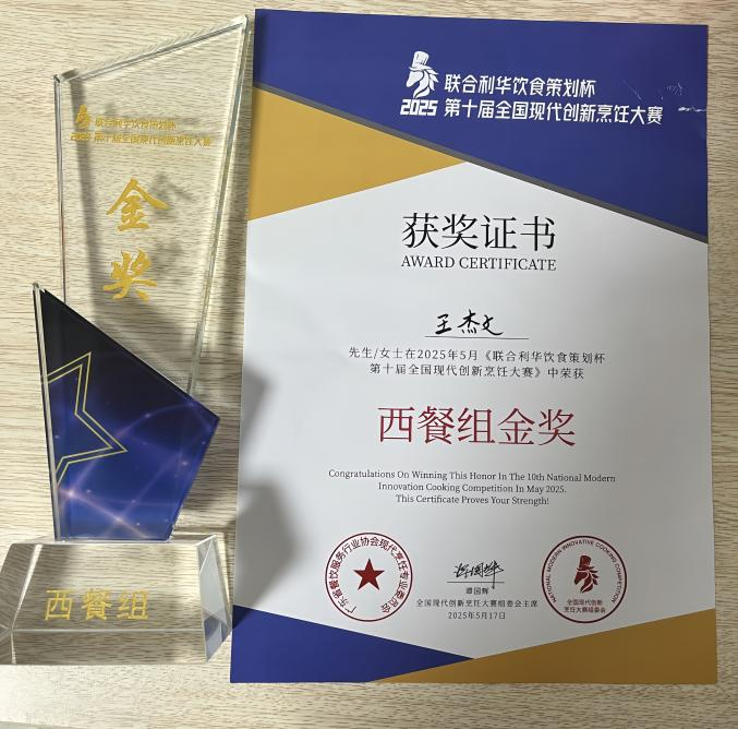 2025年5月17日,联合利华饮食策划杯第十届全国现代创新烹饪大赛在万众瞩目中落下帷幕。在线买世界杯平台酒店管理学院附属教学酒店·太阳城大酒店的西式烹饪教师王杰文凭借精湛的技艺和出色的创新能力,在西餐组中脱颖而出,一举斩获金奖,为学院和酒店赢得了极高的荣誉。