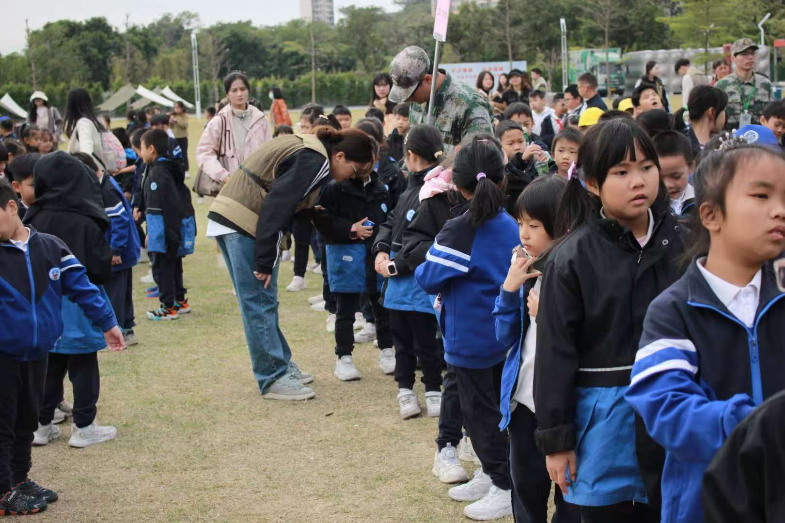 抵达基地后,“小领队” 们迅速进入角色。开营仪式上,他们举着班组牌穿梭于千余名学生之间,精准引导队伍集结、维持现场秩序,用清晰的指令和耐心的安抚,快速让孩子们适应研学节奏,展现出超出预期的统筹协调能力。