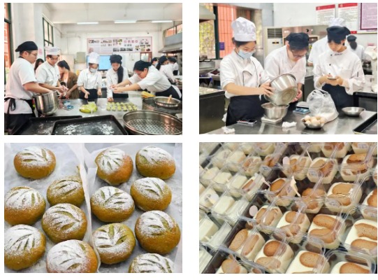 活动现场,酒店管理学院的同学们精心准备了丰富多样的茶点心和调制茶饮,展示了他们在专业课程中学到的精湛技艺。在西式点心制作与展示中,只见身穿白色实训服的酒管学子们化身成面点小师傅,他们分工有序、专注认真地进行点心美食的制作。他们技能娴熟地制作着点心甜品,有人负责和面,有人负责包制,有人则在精心装饰每一件点心,确保每一份作品都能达到最佳状态。而在茶饮品调制环节,酒管学子俨然成为了调酒师,熟练地操作着调饮器具,不一会儿工夫,便调制出一杯杯色彩斑斓、口感独特的创意茶饮品。在作品展示区,造型精美的提拉米苏、面包等甜品吸引了众多目光,而一杯杯色彩迷人的创意茶品则赢得了来宾们“卡卡卡”拍照打卡。