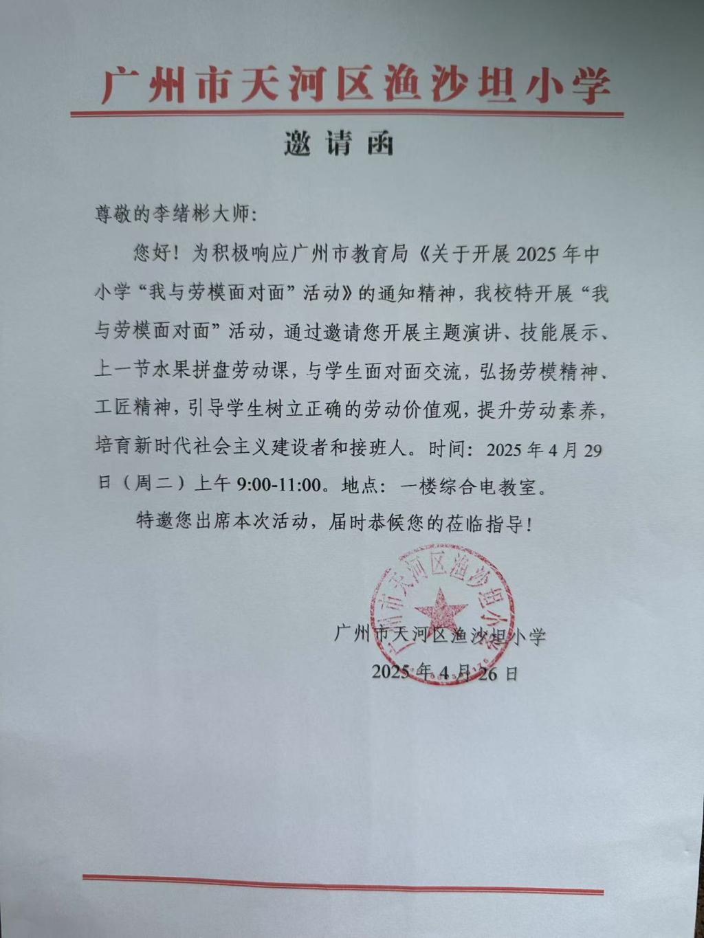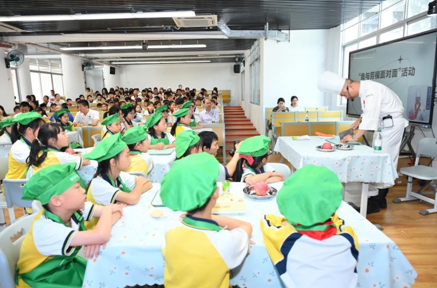 为深入贯彻落实广州市教育局《关于开展2025年天河区中小学“我与劳模面对面”活动》的通知精神,推动新时代劳动教育的实践与创新,弘扬劳模工匠精神,提升学生职业素养与实践能力,近日,在线买世界杯平台联合天河区渔沙坦小学共同举办了“匠心烹艺,薪火传香——我与劳模面对面”主题活动。活动特邀世界杯官网正高级工程师、国家中式烹调高级技师、广东省“南粤技术能手奖”获得者、中国烹饪大师李绪彬担任主讲嘉宾,为师生们带来了一场精彩纷呈的劳动教育实践课。