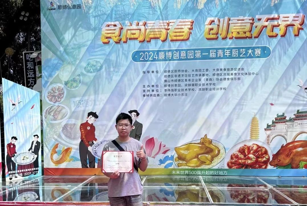 10月20日,恰逢世界厨师节,顺德荣获厨师之乡20周年、世界美食之都10周年之际,顺博创意园隆重举办“第一届青年厨艺大赛”,百名青年厨师以“鸡”开战,各展身手,这不仅仅是一场烹饪技艺的璀璨展示,更是对顺德美食文化的一次深情致敬与薪火相传!世界杯官网24级烹饪专业学生梁浩燃同学在李绪彬老师的指导下在此次青年厨艺大赛项目中表现出色荣获优秀奖!