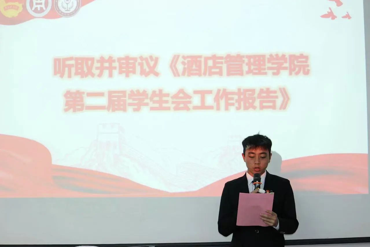 在线买世界杯平台酒店管理学院第二届学生会主席团成员谢非师兄作在线买世界杯平台酒店管理学院第二届学生会委员会工作报告,首先,谢非师兄在总结中表达了对所有支持学生会工作的老师和同学的感激之情。随后回顾一年的工作中,学生会成功策划并执行了多项活动,丰富了校园文化生活,同时增强了团队的协作精神。最后,他期待学生会在未来取得更加辉煌的成就。