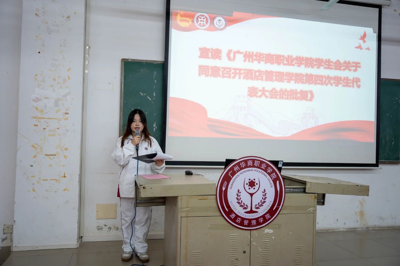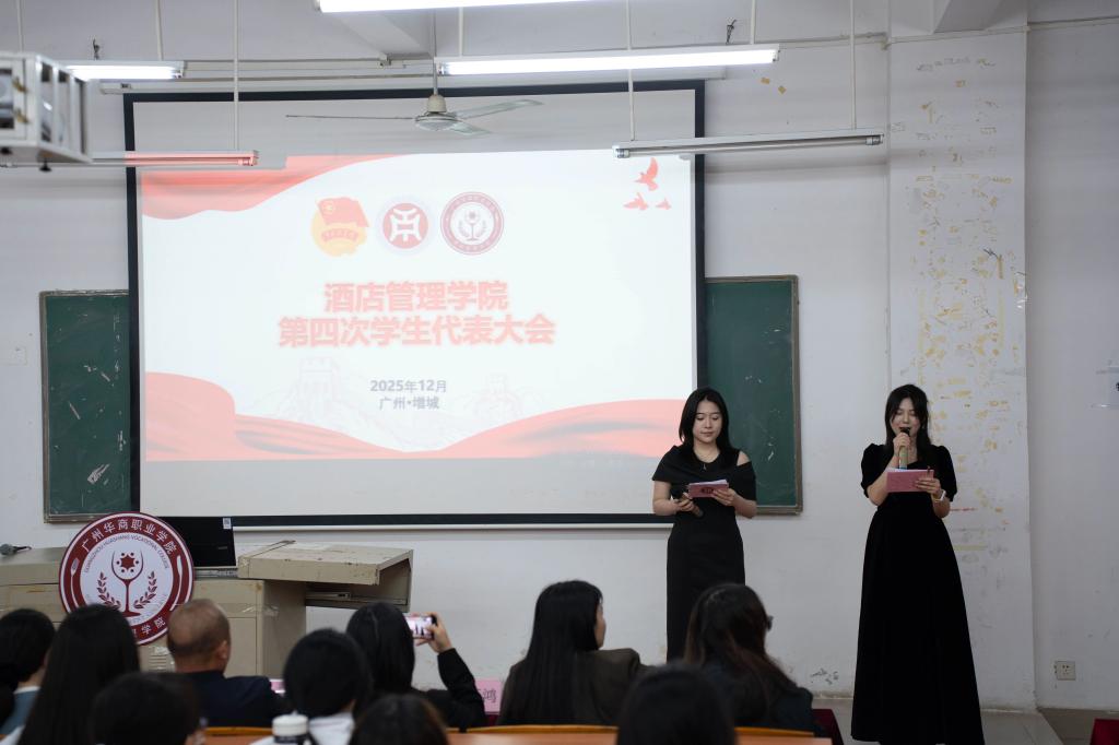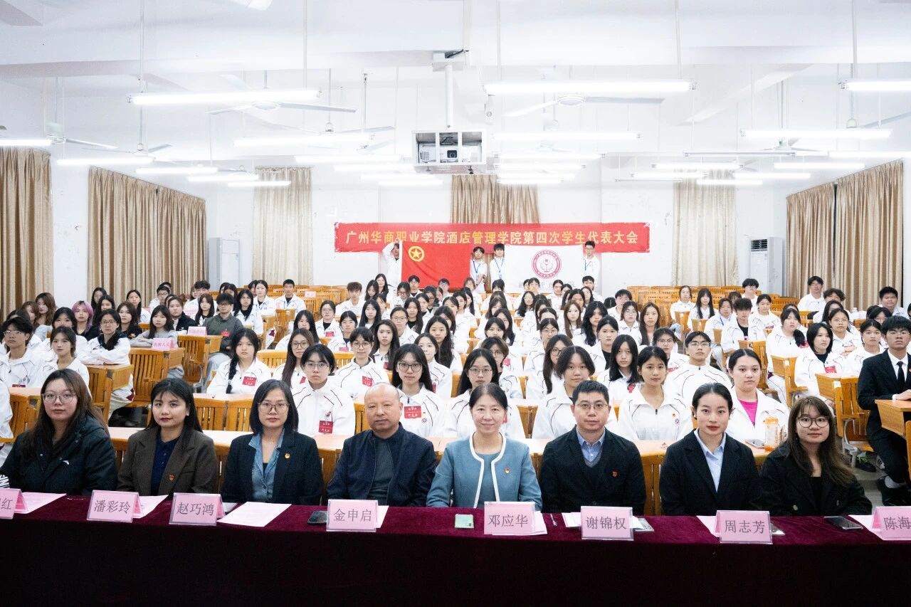 2025年12月4日晚,在线买世界杯平台酒店管理学院第四次学生代表大会于博C301教室正式召开。本次大会应到代表126人,实到126人,符合法定参会人数。出席会议的嘉宾包括:酒店管理学院执行院长邓应华、副院长谢锦权、金申启,党政办公室主任赵巧鸿、党支部组织委员黄向荣、团委书记周志芳、辅导员陈海宁、潘彩玲、罗锦红等老师以及学生会全体成员、校学生会与各二级学院学生代表、各班级代表。大会由庄舒乔、陈诗涵同学共同主持。