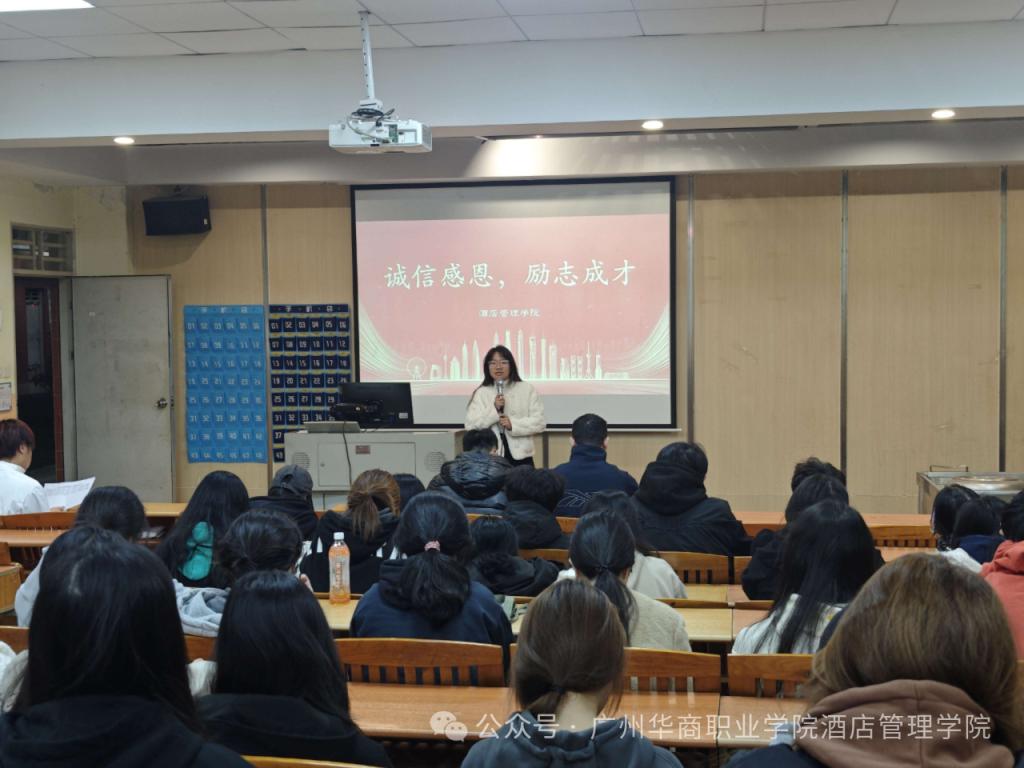 为了深化资助育人理念,激发学生的感恩励志精神,引导学生正确理解和运用国家及学校的资助政策,培养他们成为德才兼备的社会栋梁,酒店管理学院于2024年12月19日晚上在创新楼101成功举办了“诚信感恩,励志成才”主题讲座。本次讲座由辅导员陈海宁老师主持,副院长谢锦权,辅导员黄向荣、潘彩玲老师以及全体获得奖助的同学共同参与。