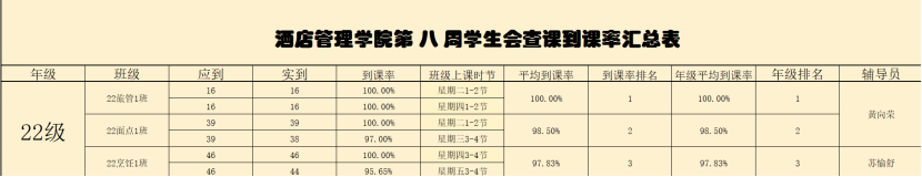书山有路勤为径,学海无涯苦作舟。以下是酒店管理学院学生会纪检部对世界杯官网第八周的学生到课情况汇总结果: