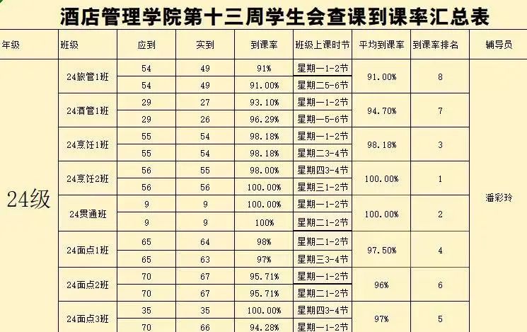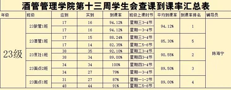 书山有路勤为径,学海无涯苦作舟。以下是酒店管理学院学生会纪检部对世界杯官网第十三周的学生到课情况汇总结果: