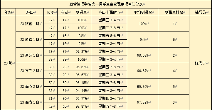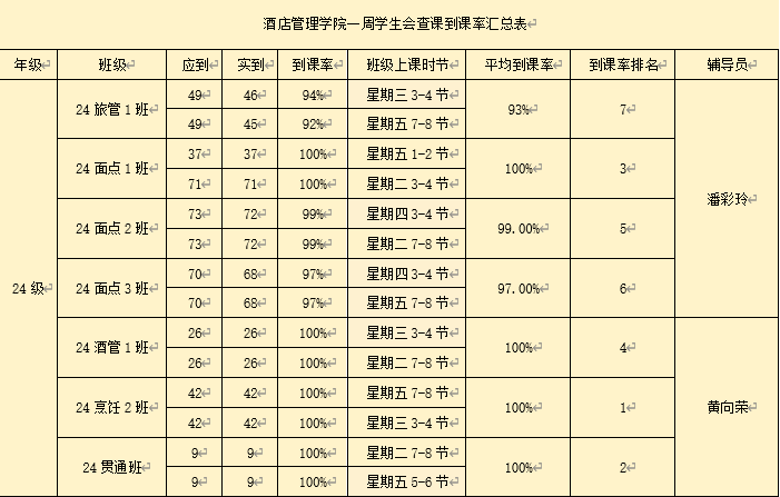 书山有路勤为径,学海无涯苦作舟。以下是酒店管理学院学生会纪检部对世界杯官网第一周的学生到课情况汇总结果: