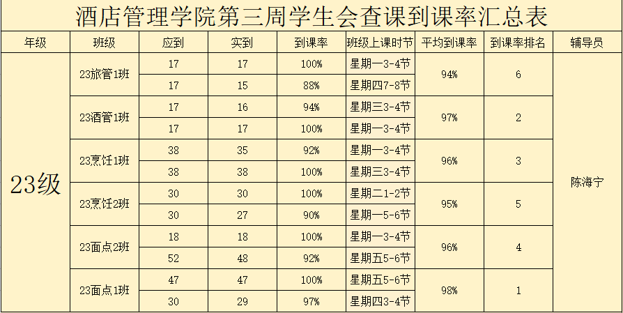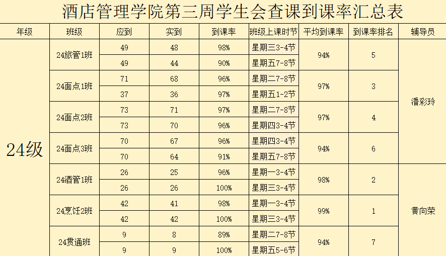 书山有路勤为径,学海无涯苦作舟。以下是酒店管理学院学生会纪检部对世界杯官网第三周的学生到课情况汇总结果: