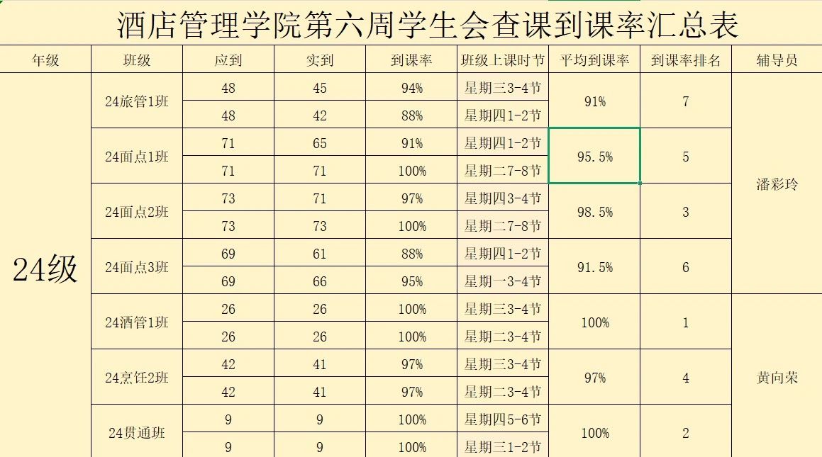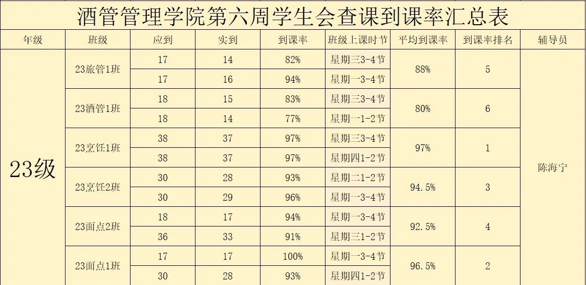 书山有路勤为径,学海无涯苦作舟。以下是酒店管理学院学生会纪检部对世界杯官网第六周的学生到课情况汇总结果:
