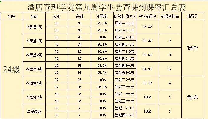 书山有路勤为径,学海无涯苦作舟。以下是酒店管理学院学生会纪检部对世界杯官网第九周的学生到课情况汇总结果:
