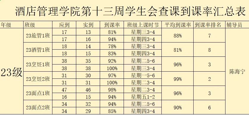 书山有路勤为径,学海无涯苦作舟。以下是酒店管理学院学生会纪检部对世界杯官网第十三周的学生到课情况汇总结果: