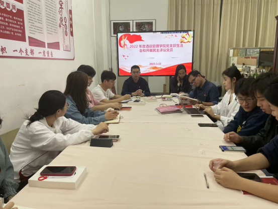 按照《中共在线买世界杯平台委员会关于召开 2022 年度基层党支部组织生活会和开展民主评议党员的通知》工作要求,3月23日下午,酒店管理学院党支部召开了 2022 年度组织生活会和开展民主评议。支部全体师生党员参加了会议,党支部书记谢锦权主持了会议。