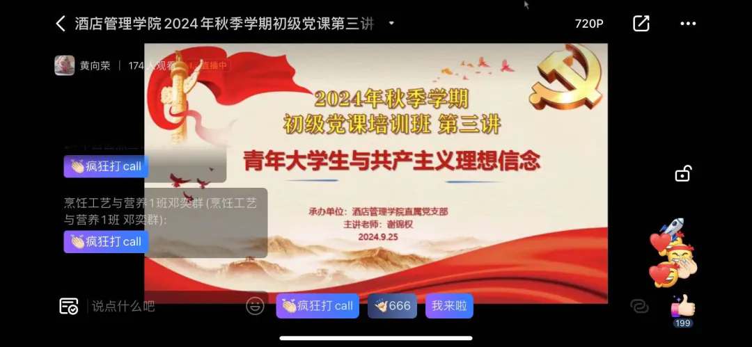 为切实加强入党积极分子的教育培养工作,帮助大学生树立共产主义理想信念,酒店管理学院直属党支部于9月25日中午在创教101开展了初级党课第三讲。世界杯官网副院长、党支部副书记谢锦权主讲;世界杯官网24级烹饪工艺与营养2班、24级旅游管理1班和24级酒店管理与数字化运营1班全体同学现场参加了党课,其他同学则通过钉钉平台在线同步学习。