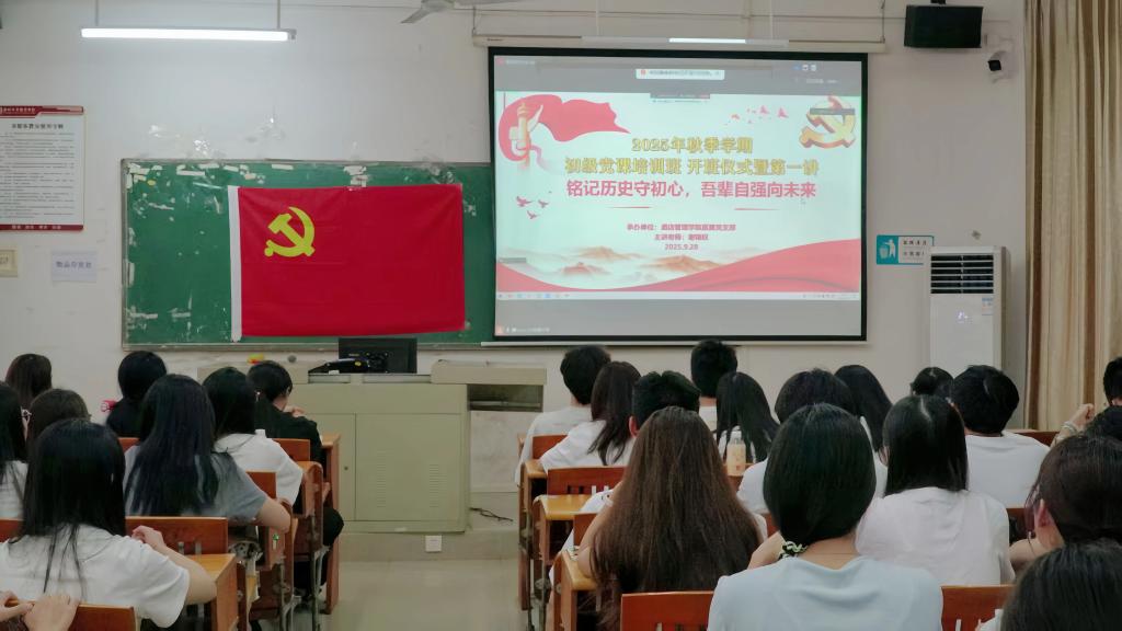 为加强青年大学生党性教育、端正其入党动机,引导青年学子树立正确的世界观、人生观与价值观,酒店管理学院直属党支部于9月28日中午,在创新楼101和博C202顺利举办2025年秋季学期初级党课开班仪式暨第一讲。本次活动由学院党支部组织委员黄向荣老师主持,党支部副书记谢锦权老师担任主讲。