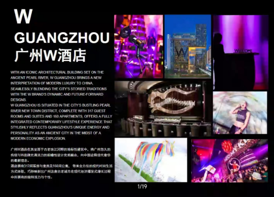 广州W酒店坐落在华南地标珠江之畔,以生机勃勃的城市元素为经纬线,汇聚一系列现代建筑、历史遗迹、豪华购物中心和娱乐场所,向中国诠释现代奢华的最新理念。酒店地处广州市中心,步行可达多处历史景点以及地铁和广州东站。酒店内设多家餐厅,供应地道的中餐、日料和国际风味人气美食,让广大美食爱好者一饱口福。酒店的两大充满动感能量的WOOBAR酒吧和妃吧,更为广州这座城市打造全新时尚生活地标。