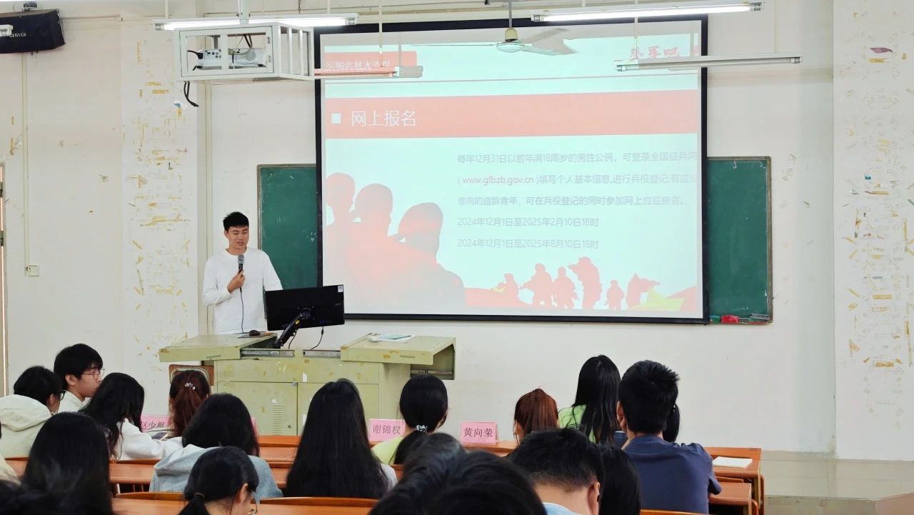 随后,第二位分享的师兄是目前就读于惠州学院的邓明端师兄,他先是讲述了自己入伍前的心路历程,从最初对军旅生活的憧憬,到克服家人担忧、朋友质疑等重重困难,坚定自己的选择。他详细介绍了入伍的各项流程,包括如何报名、体检的注意事项、政审环节需要准备的材料等,为那些有入伍想法却对流程不太清楚的同学们提供了清晰的指引。此外,他还提到了专升本的复习方法以及资料的选择,告诉同学们要善于甄别,选择那些紧扣考试大纲、讲解清晰透彻的教材和辅导资料,同时要多参考历年真题,分析命题规律,有针对性地进行复习。